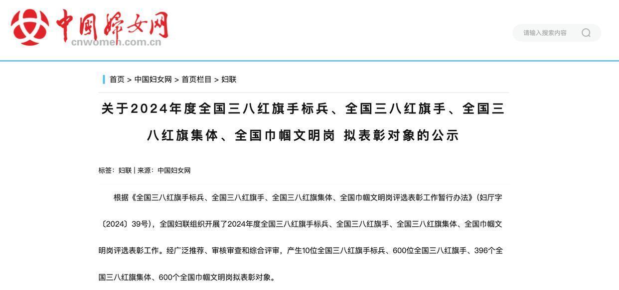 2月20日,中国妇女网发布公示,拟表彰10位全国三八红旗手标兵、600位全国三八红旗手、396个全国三八红旗集体、600个全国巾帼文明岗。